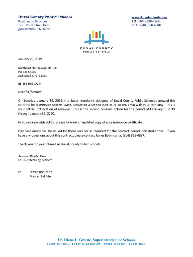 Duval County Public Schools Purchasing Services 1701 Prudential Drive Jacksonville, FL 32207www.duvalschools.org PH: (904) 8584848 FAX: (904)8584868January 29, 2019 Northeast Florida Asphalt, LLC.