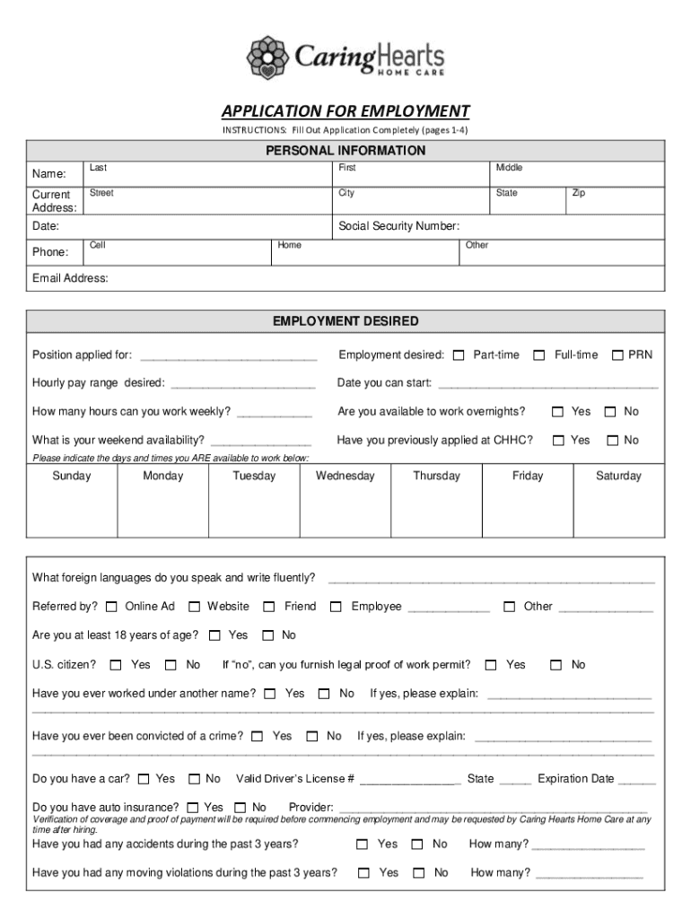 APPLICATION FOR EMPLOYMENT INSTRUCTIONS: Fill Out Application Completely (pages 14)PERSONAL INFORMATION Name: Current Address:LastFirstMiddleStreetCityStateDate: Phone:Biosocial Security Number: CellHomeOtherEmail