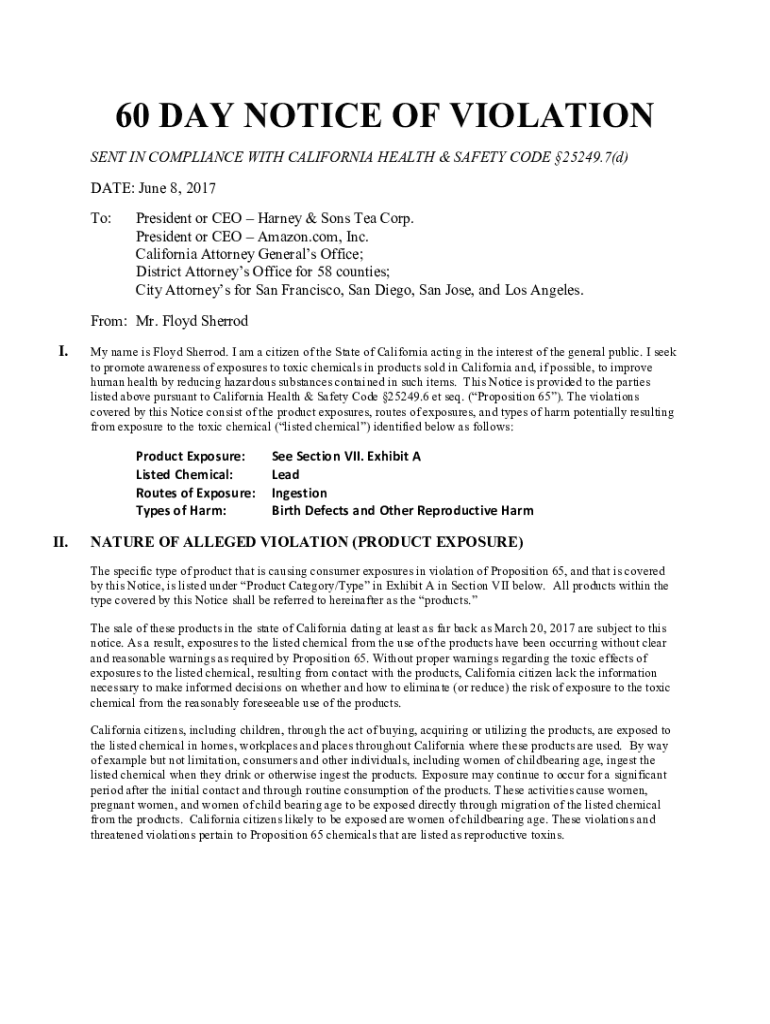 60 DAY NOTICE OF VIOLATION SENT IN COMPLIANCE WITH CALIFORNIA HEALTH & SAFETY CODE 25249.7(d) DATE: June 8, 2017, To:President or CEO Harvey & Sons Tea Corp. President or CEO Amazon.com, Inc. California