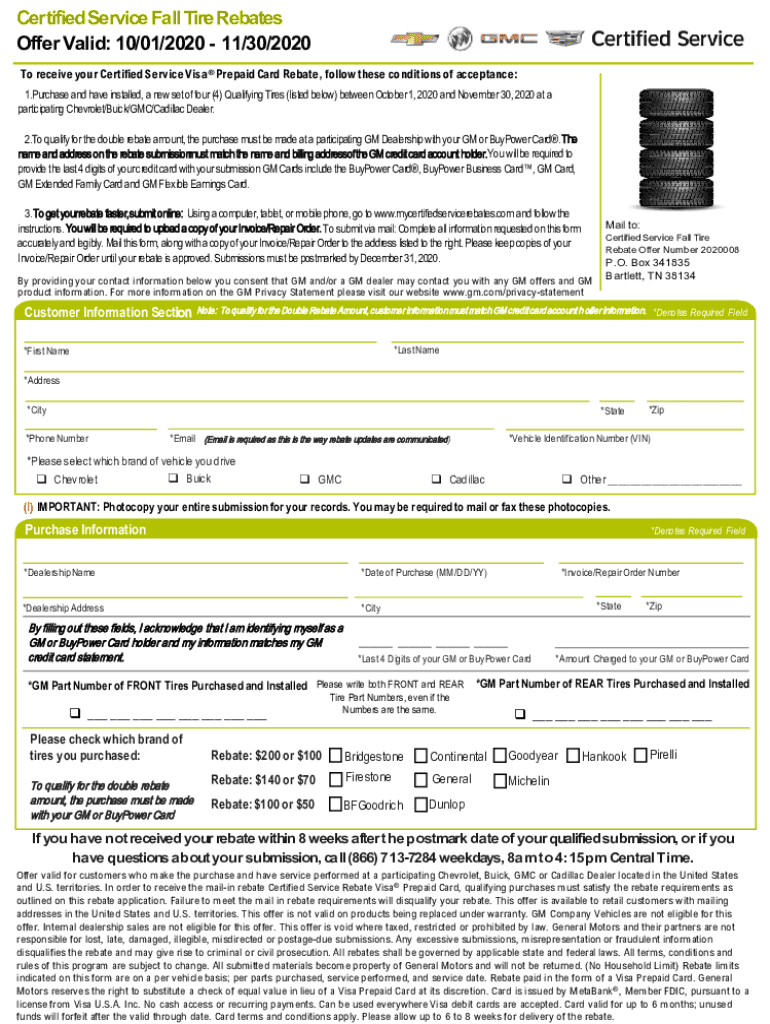 Certified Service Fall Tire Rebates Offer Valid: 10/01/2020 11/30/2020 To receive your Certified Service Visa Prepaid Card Rebate, follow these conditions of acceptance: 1. Purchase and have installed,