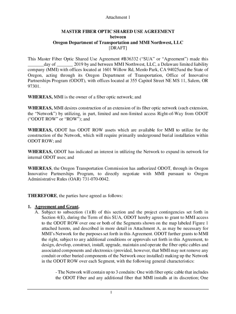 Attachment 1 MASTER FIBER OPTIC SHARED USE AGREEMENT between Oregon Department of Transportation and MMI Northwest, LLC DRAFT This Master Fiber Optic Shared Use Agreement #B36332 (SUA or Agreement)