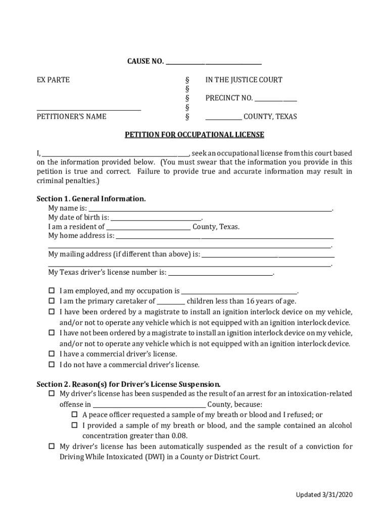 CAUSE NO. EX PARTE PETITIONERS NAME IN THE JUSTICE COURTPRECINCT NO. COUNTY, EXASPERATION FOR OCCUPATIONAL LICENSE, seek an occupational license from this court based on the information provided below.