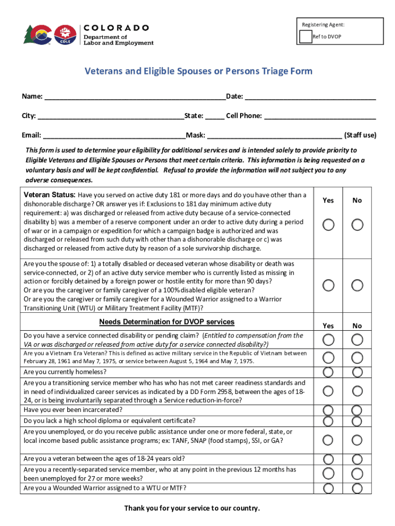 RESETRegistering Agent: Ref to DVOPVeterans and Eligible Spouses or Persons Triage Form Name: Date: City: State: Cell Phone: Email: Mask: (Staff use) This form is used to determine your eligibility