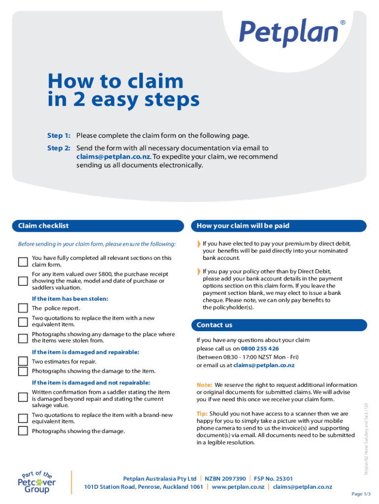 Step 2:Send the form with all necessary documentation via email toclaims@petplan.co.nz. To expedite your claim,