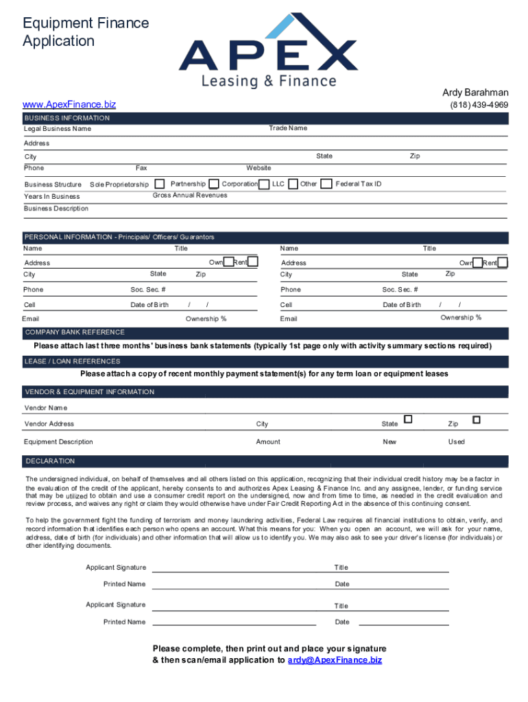 Equipment Finance Application Army Brahman www.ApexFinance.biz(818) 4394969BUSINESS INFORMATION Trade Nameless Business Name AddressStateCity Saxophone Business StructureZipWebsite Partnership Sole