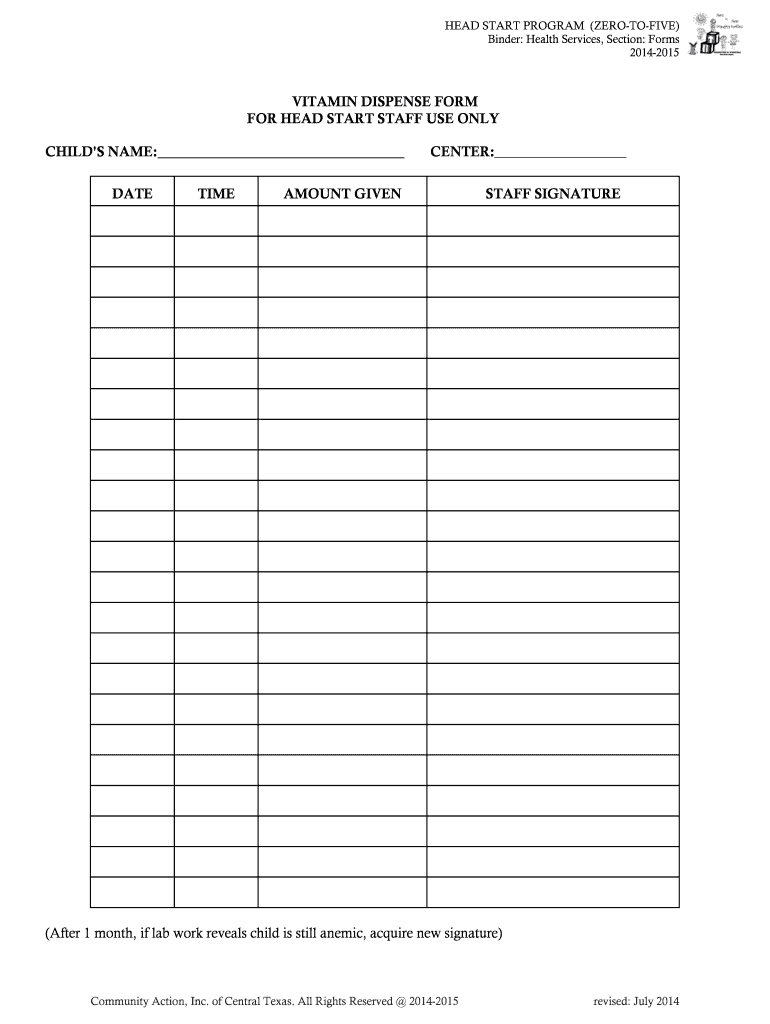 HEAD START PROGRAM (ZERO-TO-FIVE) Binder: Health Services, Section: Forms 2014-2015 VITAMIN DISPENSE FORM FOR HEAD START STAFF USE ONLY CHILD IS NAME: DATE CENTER: TIME AMOUNT GIVEN STAFF SIGNATURE