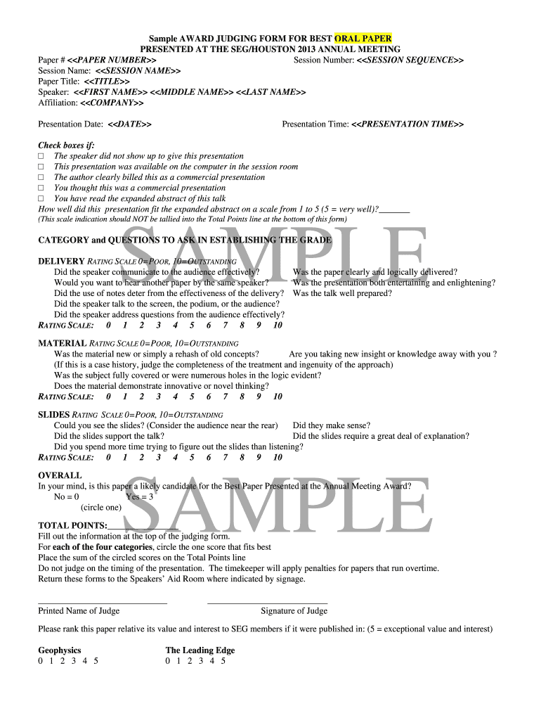 Sample AWARD JUDGING FORM FOR BEST ORAL PAPER PRESENTED AT THE SEG/HOUSTON 2013 ANNUAL MEETING Paper # PAPER NUMBER Session Number: SESSION SEQUENCE Session Name: SESSION NAME Paper Title: TITLE Speaker: