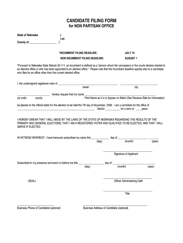 CANDIDATE FILING FORM for NON-PARTISAN OFFICE State of Nebraska County of))).SS *INCUMBENT FILING DEADLINE: JULY 15 NON-INCUMBENT FILING DEADLINE: AUGUST 1 *Pursuant to Nebraska State Statute 32-111,