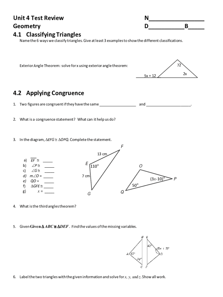 Unit 4 Test Review Geometry 4.1 Classifying Triangles D B Name the 6 ways we classify triangles. Give at least 3 examples to show the different classifications.72Exterior Angle Theorem: solve for