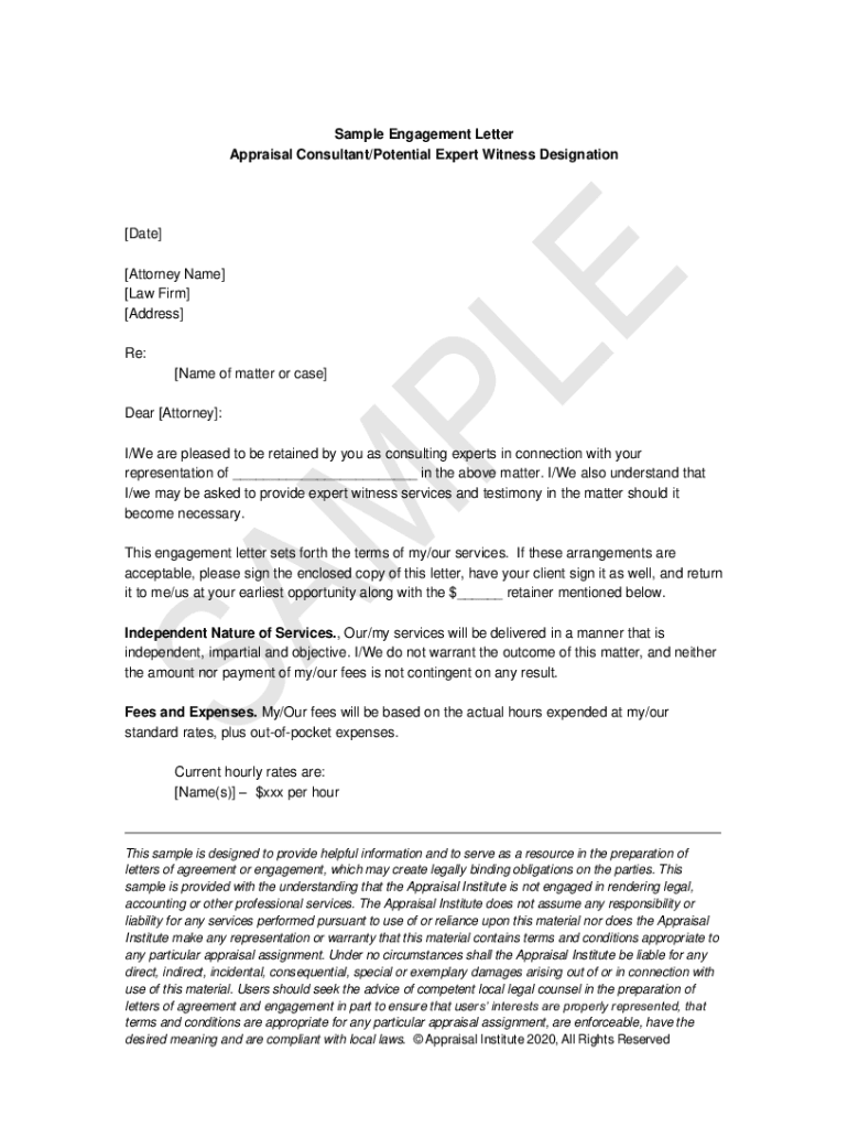 Sample Engagement Letter Appraisal Consultant/Potential Expert Witness Designation Date Attorney Name Law Firm Address Re: Name of matter or case Dear Attorney : I/We are pleased to be retained by
