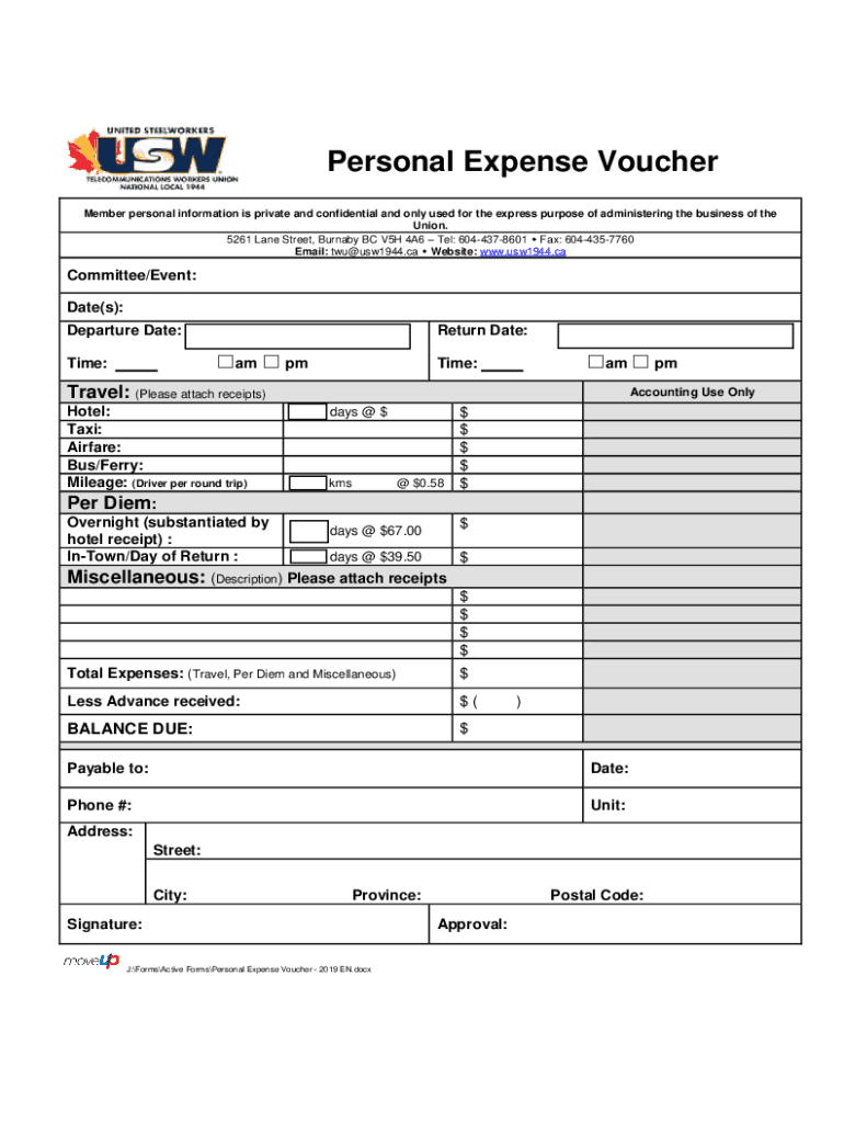 Personal Expense Voucher Member personal information is private and confidential and only used for the express purpose of administering the business of the Union. 5261 Lane Street, Burnaby BC V5H