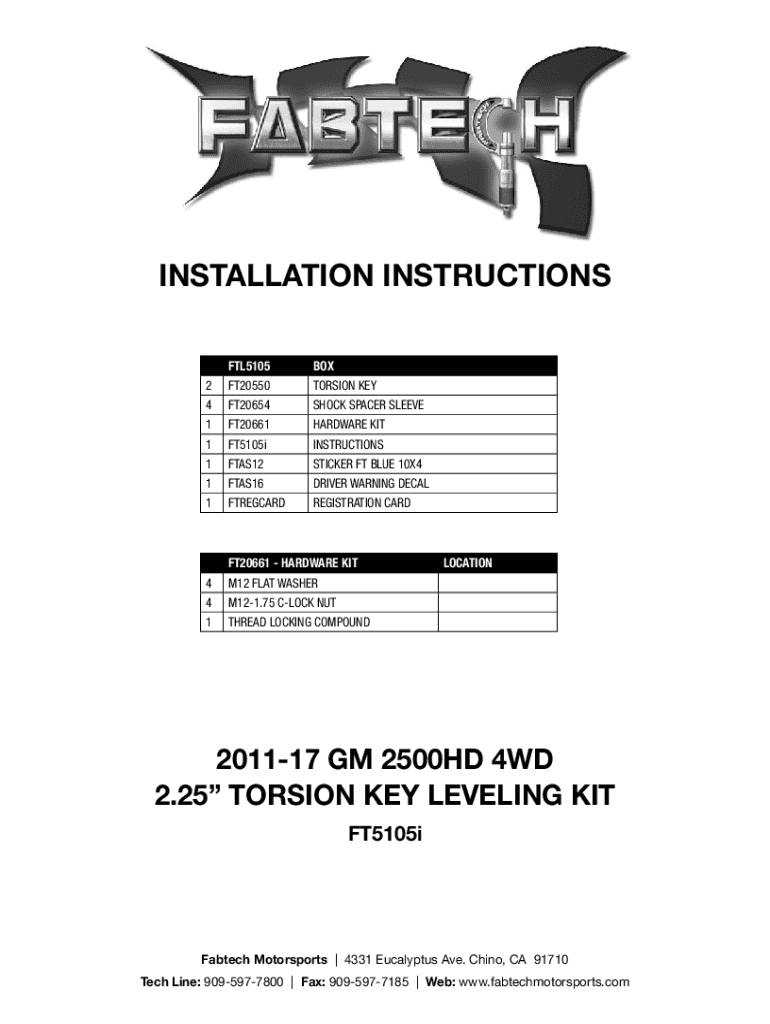 INSTALLATION INSTRUCTIONS FTL5105BOX2FT20550TORSION KEY4FT20654SHOCK SPACER SLEEVE1FT20661HARDWARE KIT1FT5105iINSTRUCTIONS1FTAS12STICKER FT BLUE 10×41FTAS16DRIVER WARNING DECAL1FTREGCARDREGISTRATION