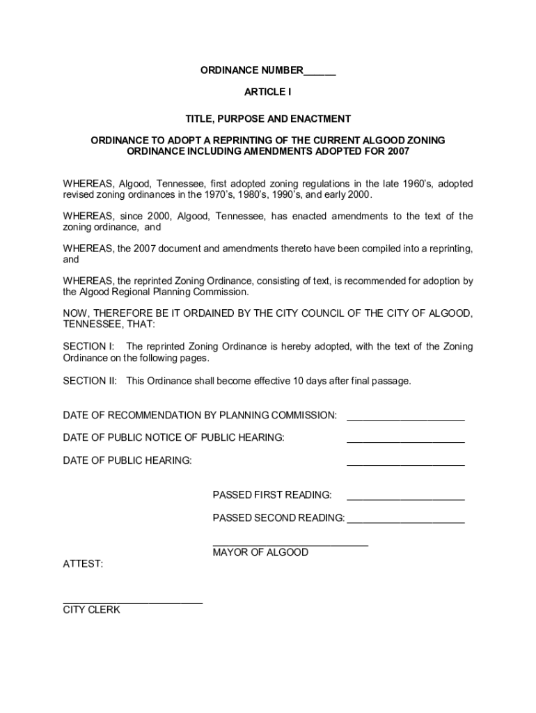 ORDINANCE NUMBER ARTICLE I TITLE, PURPOSE AND ENACTMENT ORDINANCE TO ADOPT A REPRINTING OF THE CURRENT GOOD ZONING ORDINANCE INCLUDING AMENDMENTS ADOPTED FOR 2007 WHEREAS, Algood, Tennessee, first