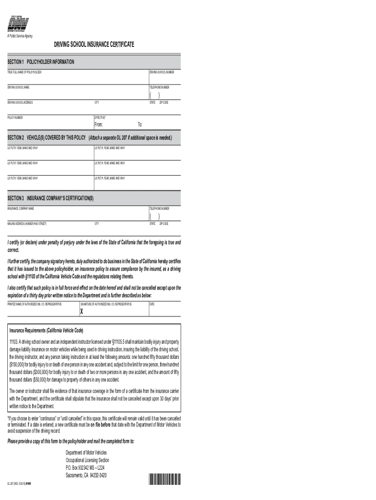 STATE OF CALIFORNIADEPARTMENT OF MOTOR Vehicles Public Service agencyDRIVING SCHOOL INSURANCE CERTIFICATE
