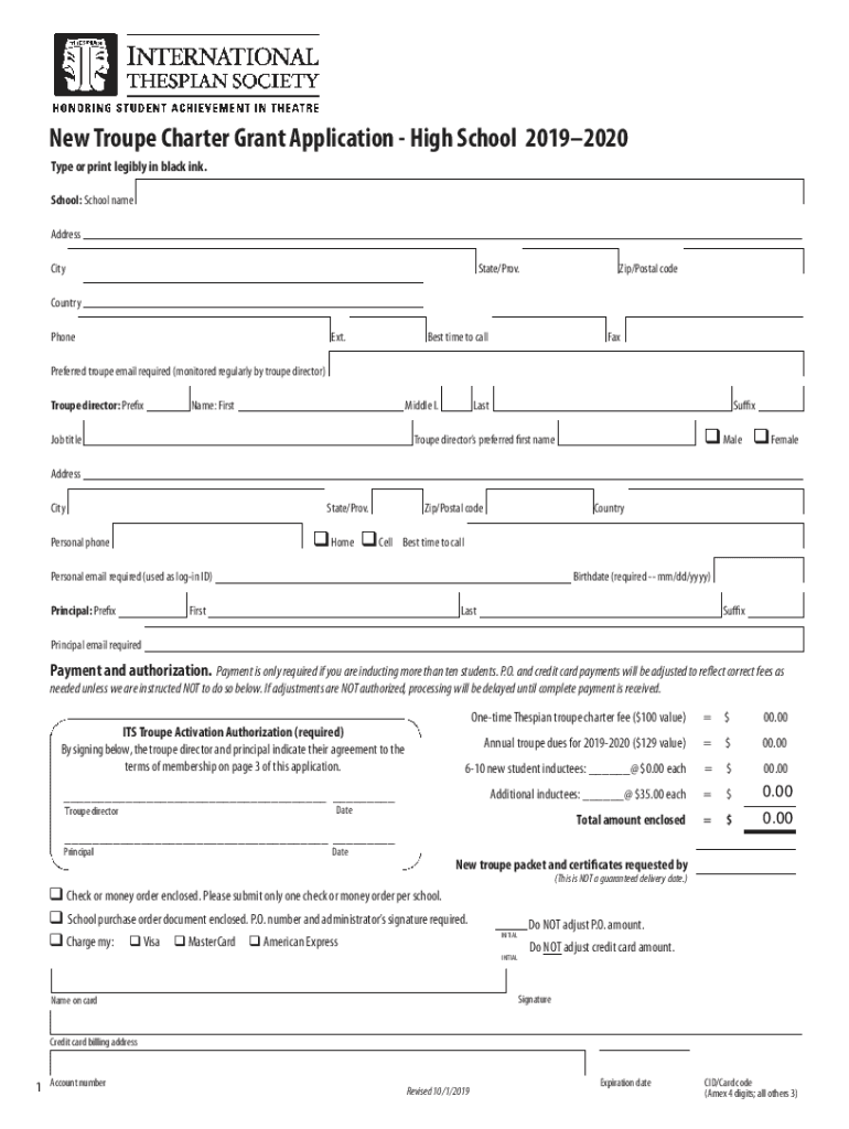 INTERNATIONAL THESPIAN SOCIETY HONORING STUDENT ACHIEVEMENT IN Threatened Troupe Charter Grant Application High School 20192020 Type or print legibly in black ink. School: School name Address Cityscape/Prov.Zip/Postal