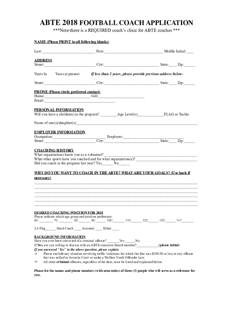 Football Coach Application Form is not the form you're looking for?Search for another form here.