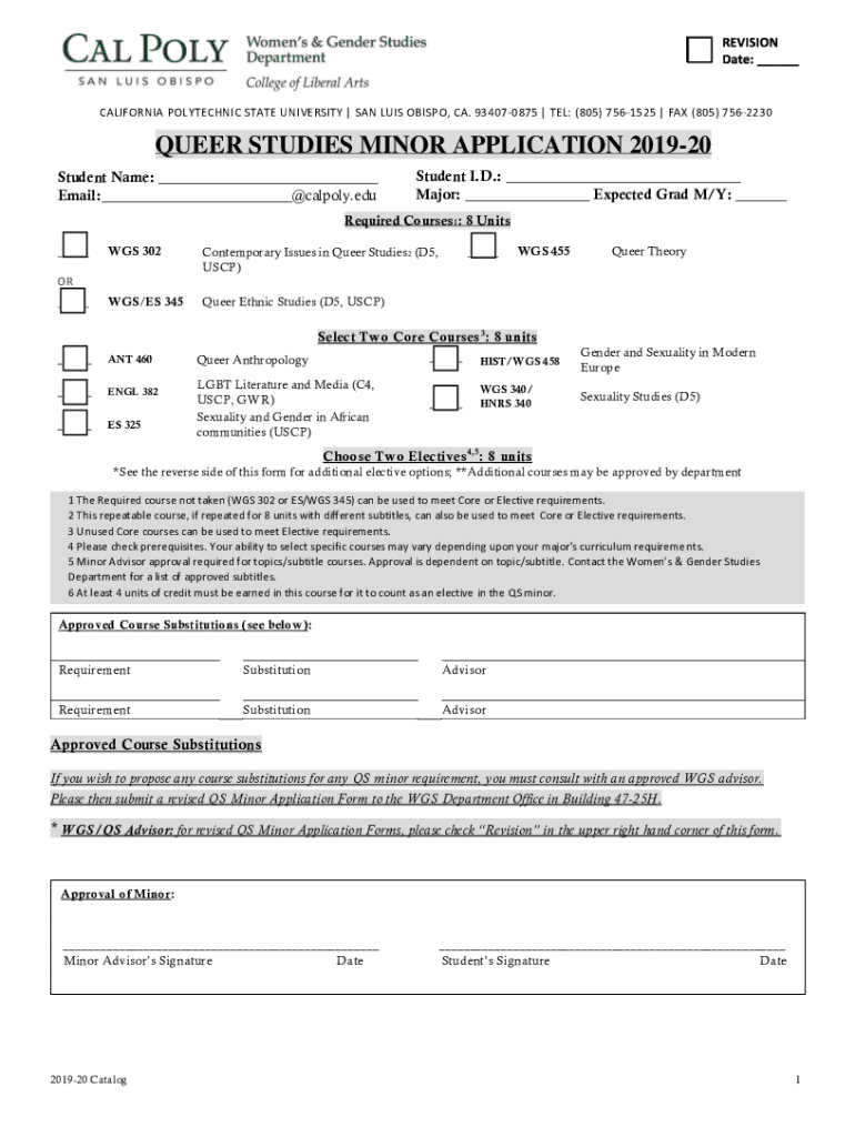 CALIFORNIA POLYTECHNIC STATE UNIVERSITY SAN LUIS OBISPO, CA. 934070875 TEL: (805) 7561525 FAX (805) 7562230QUEER STUDIES MINOR APPLICATION 201920 Student Name: Email: cal poly. Student I.D.: Major: