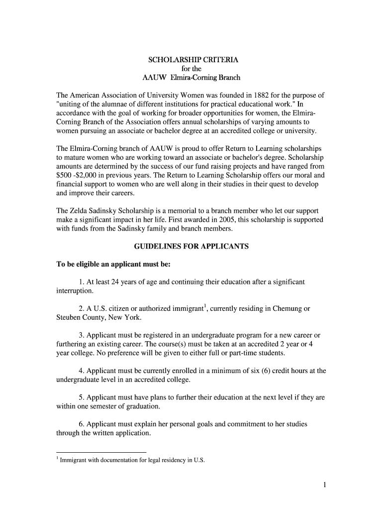 Get the free 1 SCHOLARSHIP CRITERIA SCHOLARSHIP CRITERIA for the for bb - elmiracorning-ny aauw