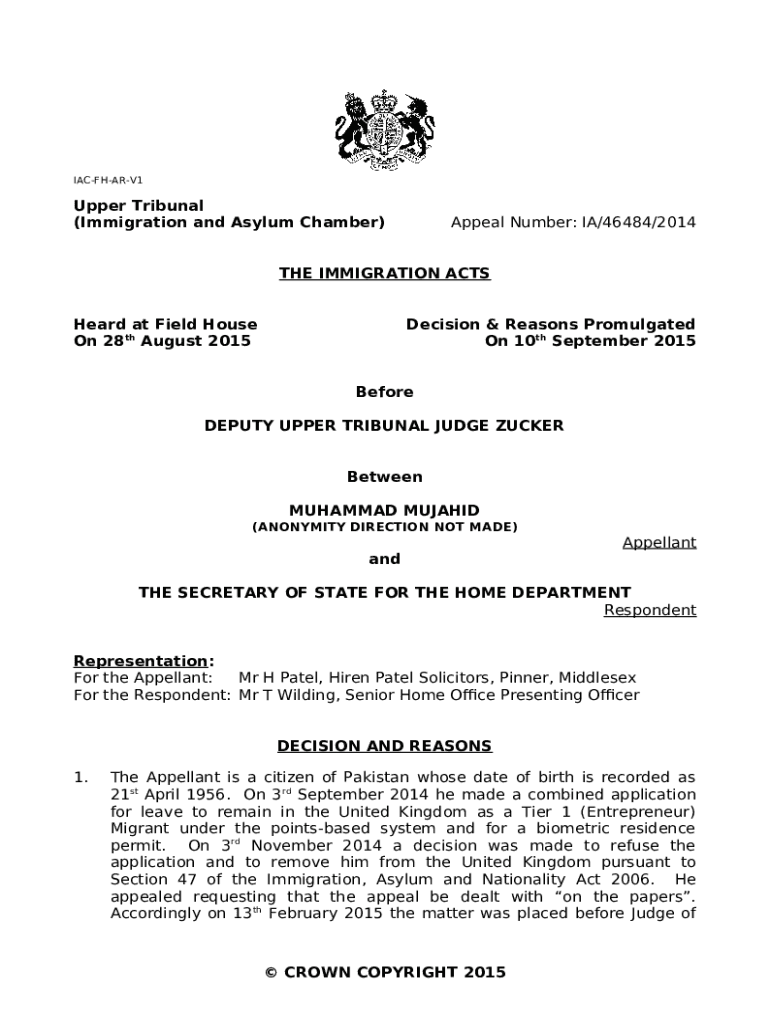 The DOC Appeal Number: IA/46484/2014 IAC-FH-AR-V1 Upper Tribunal ... is a writable document that should be submitted to the required address in order to provide certain information. It must be completed and signed, which may be done in hard copy, or with a particular software e. g. PDFfiller. It allows to complete any PDF or Word document directly from your browser (no software requred), customize it according to your requirements and put a legally-binding electronic signature. Right away after completion, the user can easily send the DOC Appeal Number: IA/46484/2014 IAC-FH-AR-V1 Upper Tribunal ... to the relevant individual, or multiple ones via email or fax. The editable template is printable as well because of PDFfiller feature and options presented for printing out adjustment. In both electronic and physical appearance, your form will have got neat and professional look. It's also possible to save it as the template for later, so you don't need to create a new blank form over and over. All you need to do is to amend the ready sample.