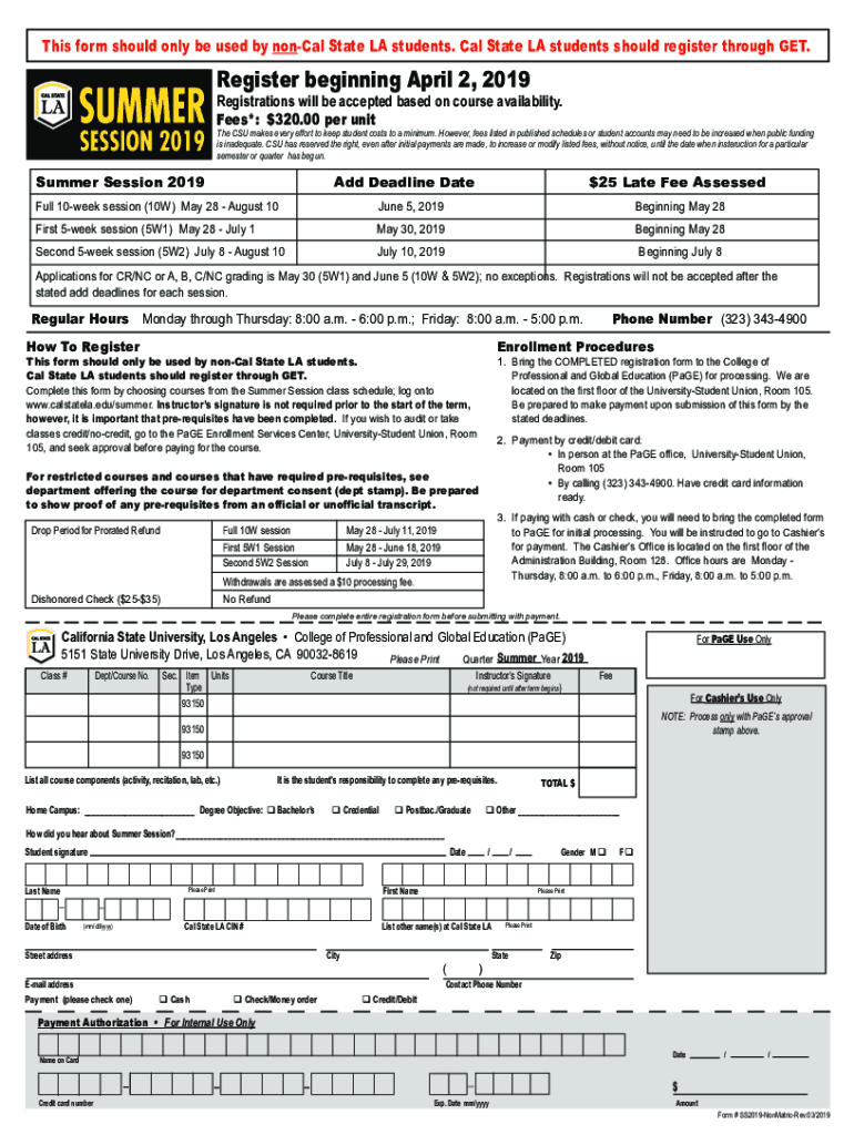 This form should only be used by nonCal State LA students. Cal State LA students should register through GET. Register beginning April 2, 2019Registrations will be accepted based on course availability.