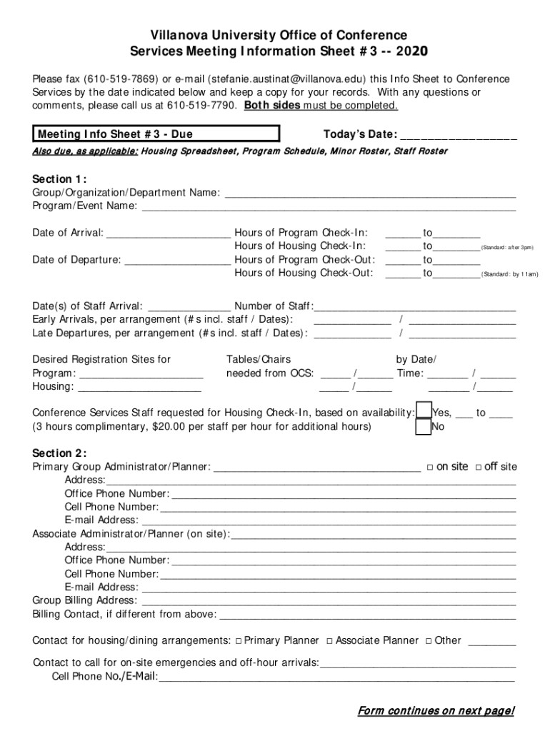 Villanova University Office of Conference Services Meeting Information Sheet #3 2020 Please fax (6105197869) or email (Stephanie. Austin Villanova.edu) this Info Sheet to Conference Services by the