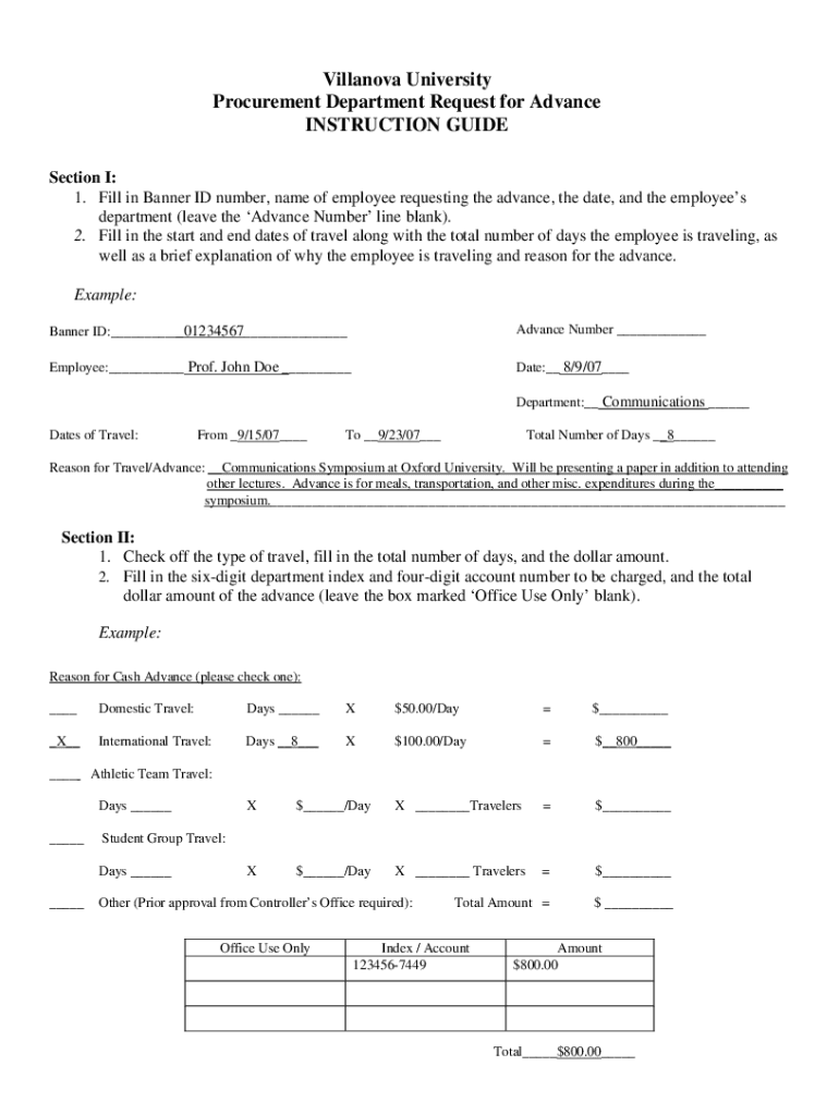 Villanova University Procurement Department Request for Advance INSTRUCTION GUIDE Section I: 1. Fill in Banner ID number, name of employee requesting the advance, the date, and the employees department