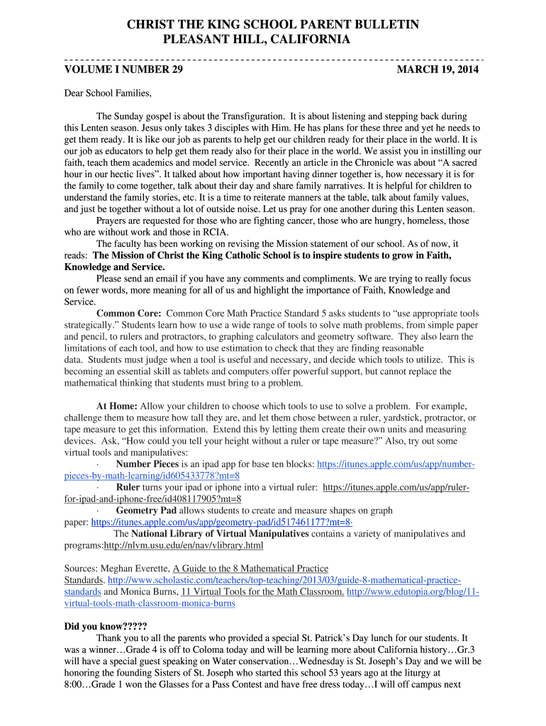 CHRIST THE KING SCHOOL PARENT BULLETIN PLEASANT HILL, CALIFORNIA VOLUME I NUMBER 29 MARCH 19, 2014, Dear School Families, The Sunday gospel is about the Transfiguration. It is about listening and