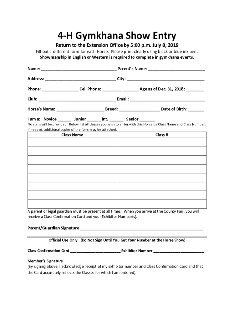 4H Gymkhana Show Entry Return to the Extension Office by 5:00 p.m. July 8, 2019, Fill out a different form for each Horse. Please print clearly using black or blue ink pen. Showmanship in English