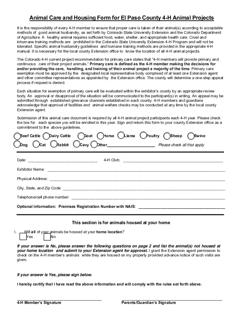Animal Care and Housing Form for El Paso County 4H Animal Projects