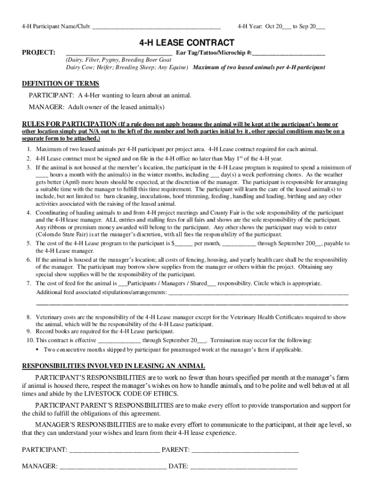 4H Participant Name/Club: 4H Year: Oct 20 to Sep 20 4H LEASE CONTRACT PROJECT: Ear Tag/Tattoo/Microchip #: (Dairy, Fiber, Pygmy, Breeding Boer Goat Dairy Cow; Heifer; Breeding Sheep; Any Equine) Maximum