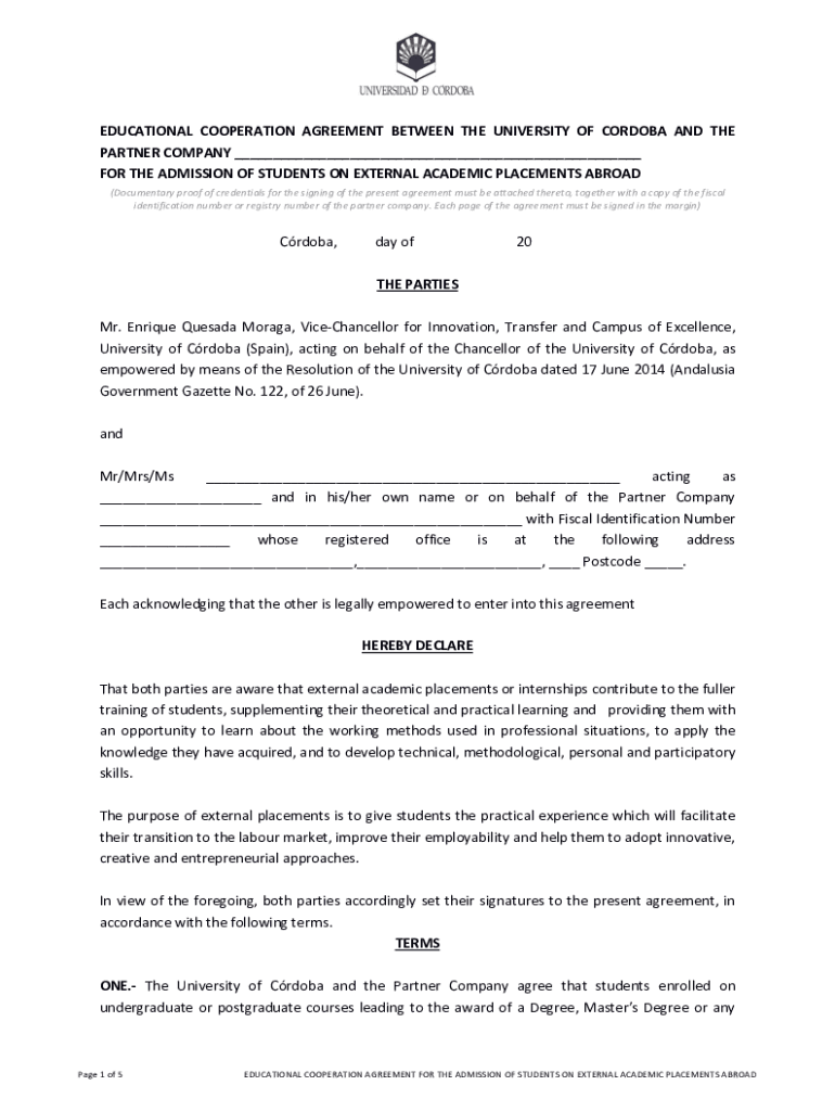 EDUCATIONAL COOPERATION AGREEMENT BETWEEN THE UNIVERSITY OF Córdoba AND THE PARTNER COMPANY FOR THE ADMISSION OF STUDENTS ON EXTERNAL ACADEMIC PLACEMENTS ABROAD (Documentary proof of credentials
