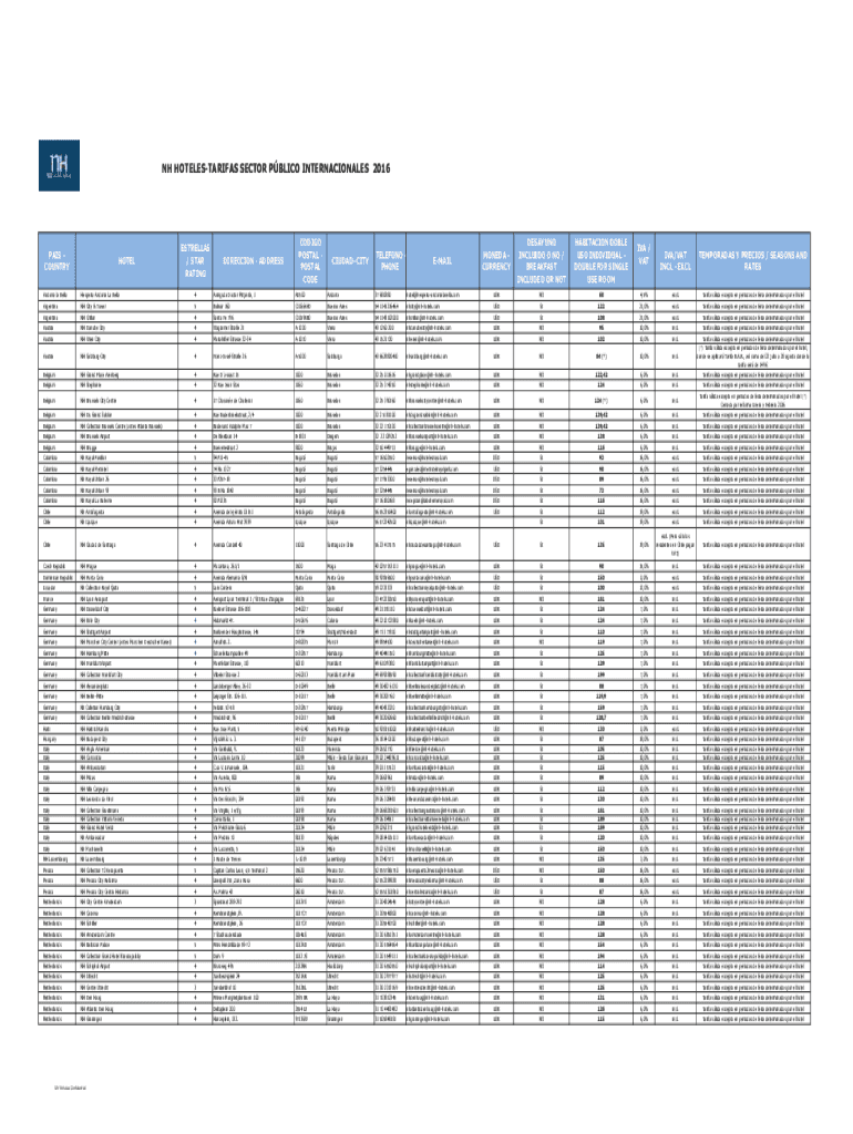 NH HOTELESTARIFAS SECTOR PBL ICO INTERNATIONALS 2016PAIS COUNTRYHOTELESTRELLAS / STAR RATINGDIRECCION ADDRESSCODIGO POSTAL CODECIUDAD CITYDESAYUNO INCLUDE O NO / BREAKFAST INCLUDED OR NOTEURHABITACION
