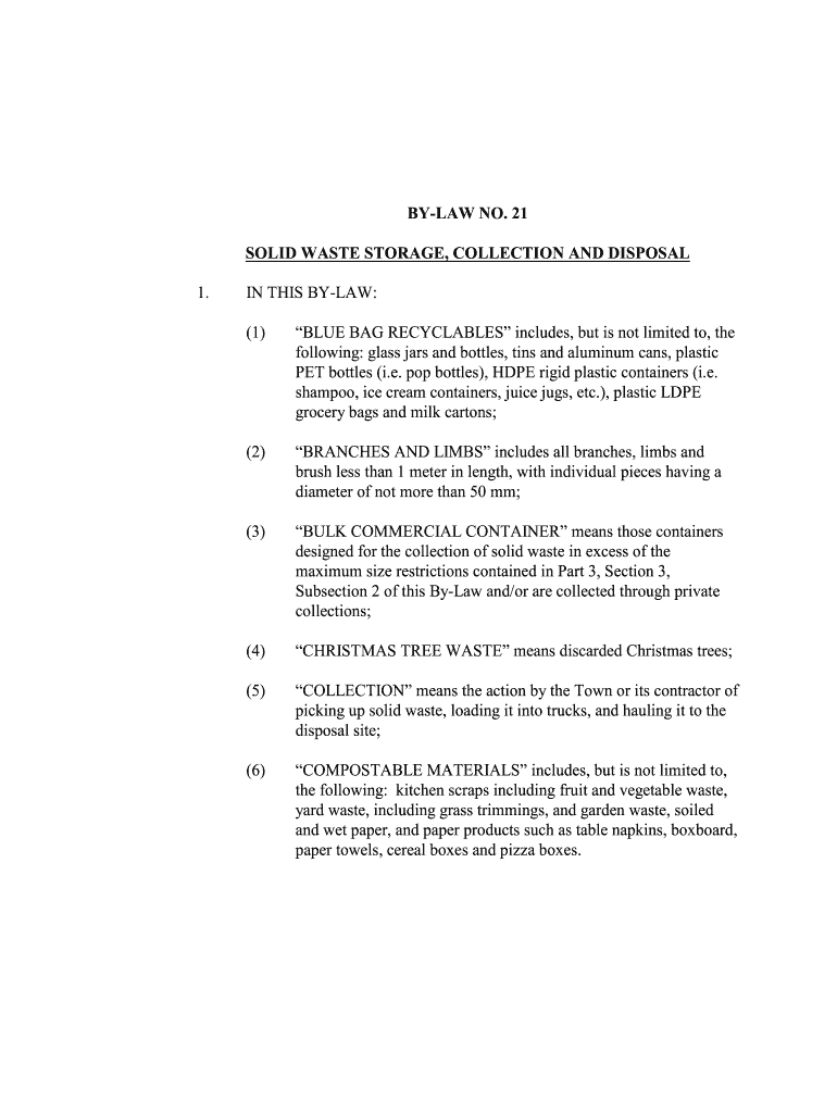 BYLAW NO. 21 SOLID WASTE STORAGE, COLLECTION AND DISPOSAL 1. IN THIS BYLAW: (1) BLUE BAG RECYCLABLES includes, but is not limited to, the following: glass jars and bottles, tins and aluminum cans,