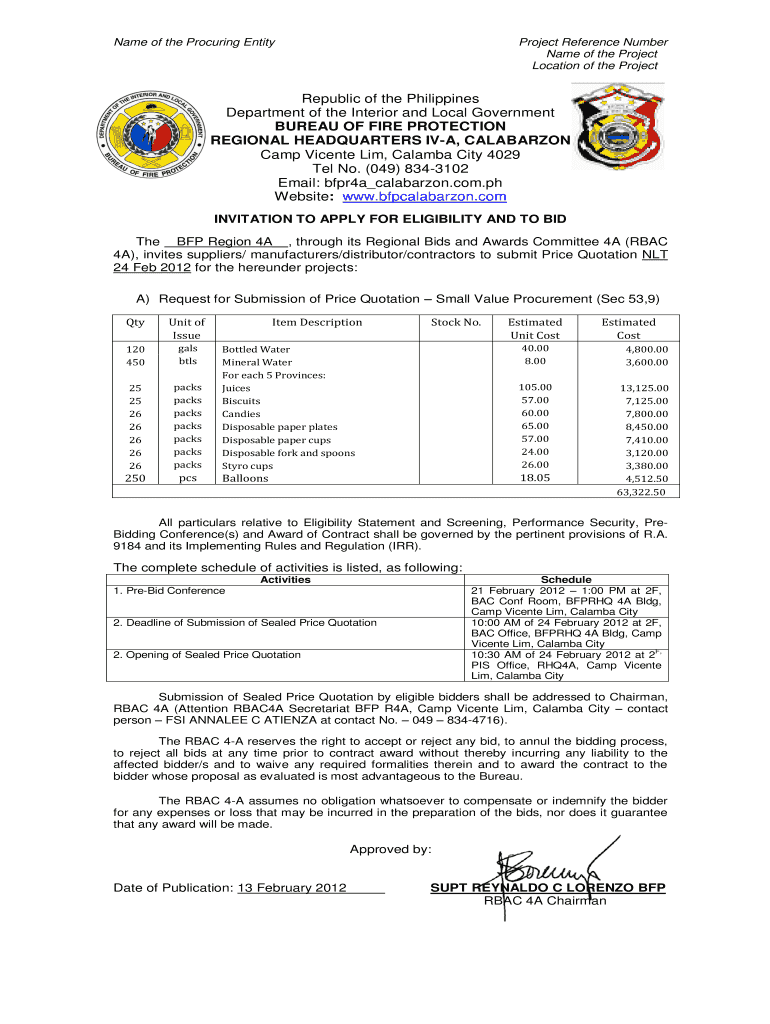 Get the free com INVITATION TO APPLY FOR ELIGIBILITY AND TO BID The BFP Region 4A , through its R...