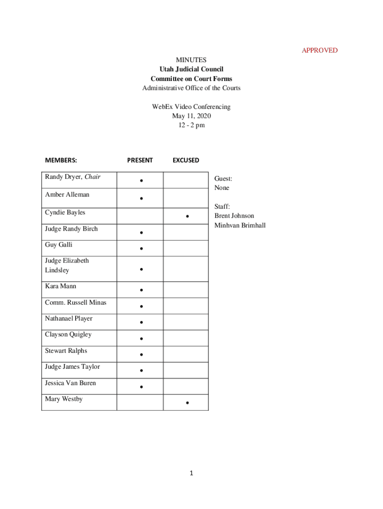 APPROVED MINUTES Utah Judicial Council Committee on Court Forms Administrative Office of the Courts WebEx Video Conferencing May 11, 2020 12 2 members:PRESENT Randy Dryer, Chair Amber AllemanCyndie