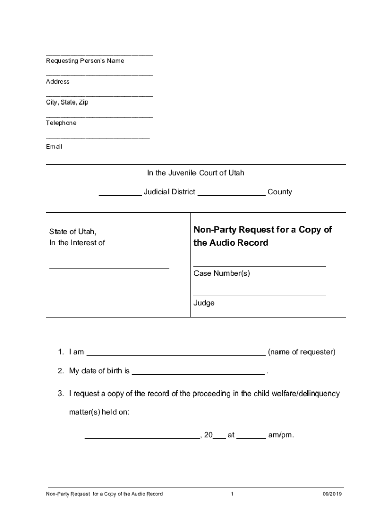 Requesting Persons Name Address City, State, Zip Telephone Emailing the Juvenile Court of Utah Judicial District CountyState of Utah, In the Interest ofNonParty Request for a Copy of the Audio Record