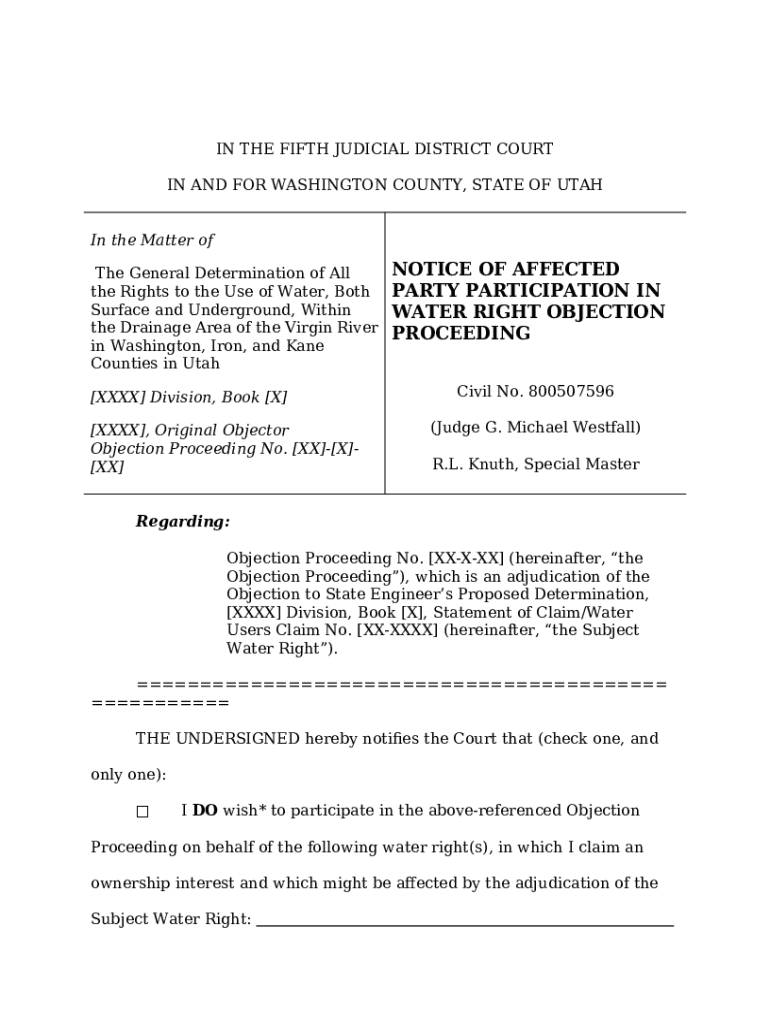 Template Notice of Affected Party Participation in Objection Proceeding instructions