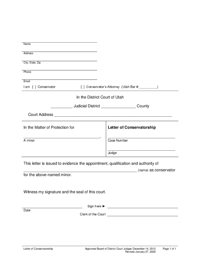 NameAddressCity, State, ZipPhoneEmailI am Conservator Conservators Attorney (Utah Bar #:)In the District Court of Utah Judicial District County Court Address In the Matter of Protection Forester of