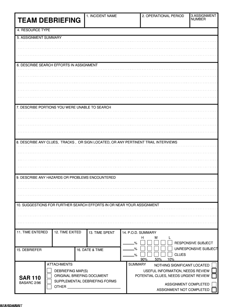 The Search and Rescue Team Debriefing Form is a debriefing document used by rescue teams to document the details and outcomes of a search and rescue operation.