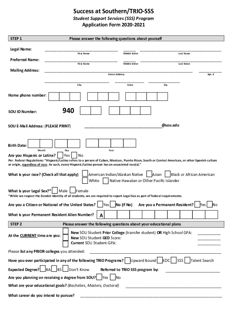 Success at Southern/TRIOSSSStudent Support Services (SSS) ProgramApplication Form 20202021STEP 1Please answer the following questions about yourselfLegal Name: Preferred Name: Mailing Address: First
