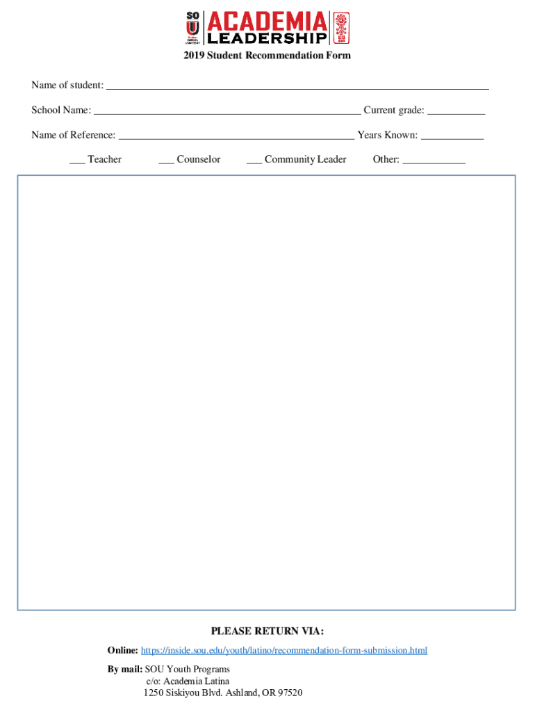2019 Student Recommendation Form Name of student: School Name: Current grade: Name of Reference: Years Known: Teacher Counselor Community LeaderOther: PLEASE RETURN VIA: Online: https://inside.sou.edu/youth/latino/recommendationformsubmission.html