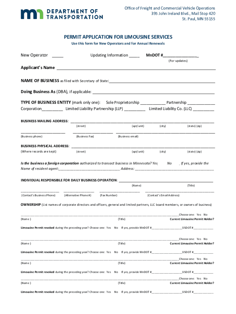 Office of Freight and Commercial Vehicle Operations 395 John Ireland Blvd., Mail Stop 420 St. Paul, MN 55155PERMIT APPLICATION FOR LIMOUSINE SERVICES Use this form for New Operators and for Annual