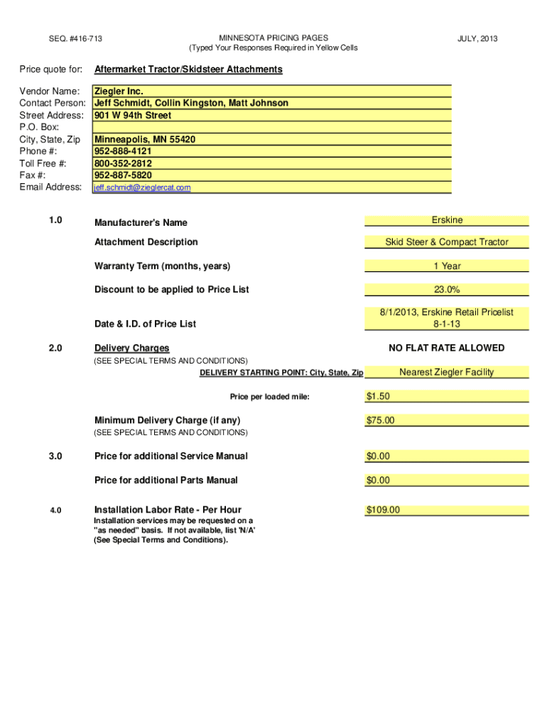 SEQ. #416713MINNESOTA PRICING PAGES (Typed Your Responses Required in Yellow Cells Price quotes for:Aftermarket Tractor/Skid steer AttachmentsVendor Name: Contact Person: Street Address: P.O. Box: