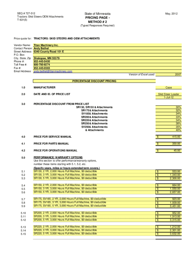 PRICING PAGE METHOD # 2May, 2012(Typed Responses Required)Price quote for: TRACTORS: SKID STEERS AND OEM ATTACHMENTS