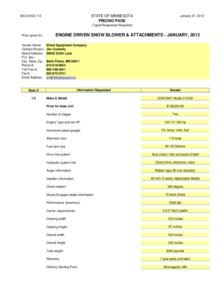 STATE OF MINNESOTA PRICING PAGES # 832112January 27, 2012(Typed Responses Required) Price quote for: Vendor Name: Contact Person: Street Address: P.O. Box: City, State, Zip Phone #: Toll Free #: Fax