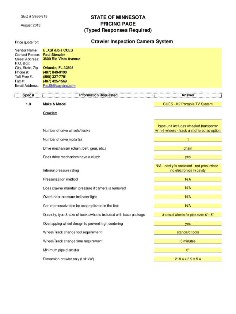 SEQ # S986813STATE OF MINNESOTA PRICING PAGE (Typed Responses Required)August 2013Crawler Inspection Camera System Price quote for: Vendor Name: Contact Person: Street Address: P.O. Box: City, State,
