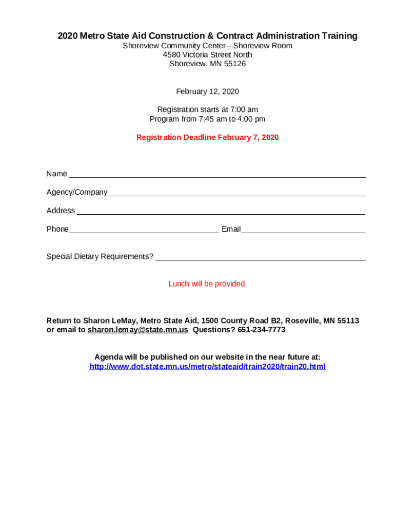 What is 2020 Metro State Aid Construction & Contract Administration Training Form?