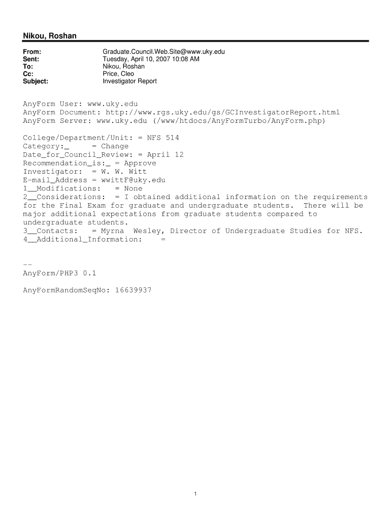 Nikon, Roshan From: Sent: To: Cc: Subject: Graduate. Council. Web. Site www.uky.edu Tuesday, April 10, 2007 10:08 AM Nikon, Roshan Price, Cleo Investigator Report Uniform User: www.uky.edu Uniform