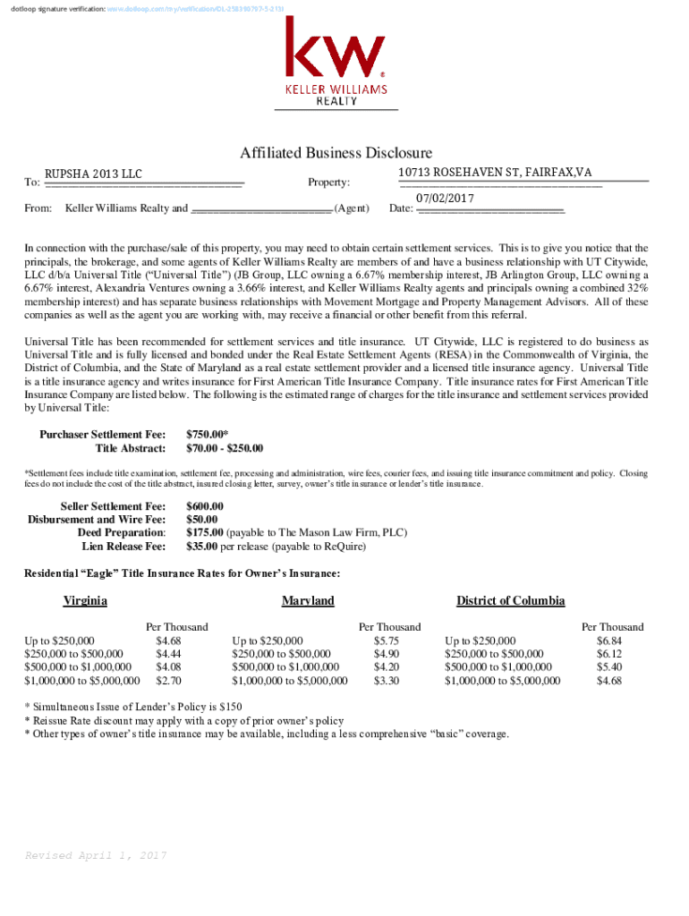 The Affiliated Business Disclosure form is a crucial document utilized in real estate transactions in Virginia. It serves to inform buyers and sellers about business relationships between real estate companies and the associated services they provide, like title and mortgage processing. Acknowledging these relationships is vital for maintaining transparency during the transaction process. This form was last revised on April 1, 2017, reflecting the ongoing commitment to clarity in real estate dealings.