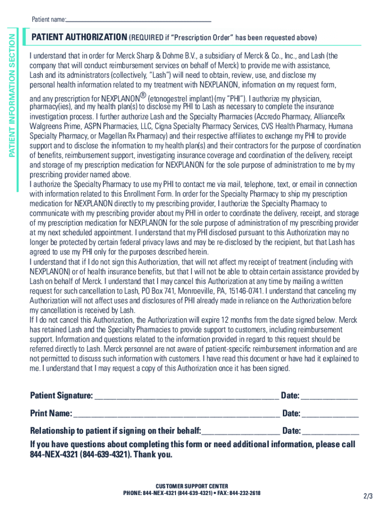 PATIENT INFORMATION SECTIONPatient name:PATIENT AUTHORIZATION (REQUIRED if Prescription Order has been requested above) I understand that in order for Merck Sharp & Dome B.V., a subsidiary of Merck